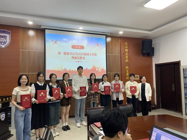 会议第三项,刘一静副书记为2024级班主任助理颁发聘书,并希望他们能够积极地辅佐班主任的工作,与同学们建立亲密联系,发挥好桥梁作用。