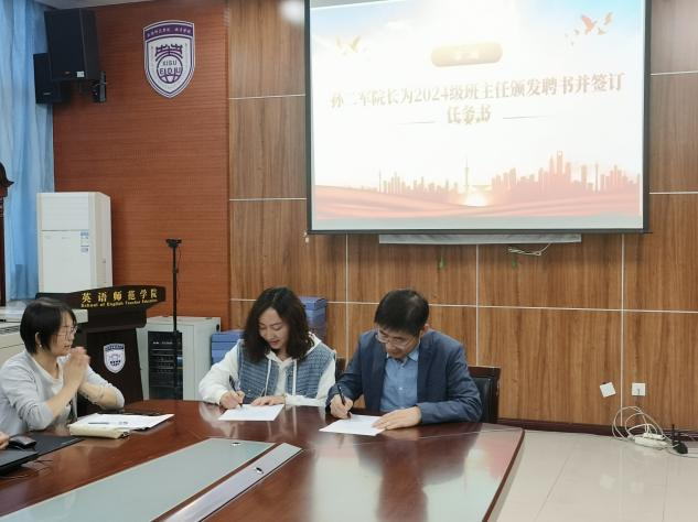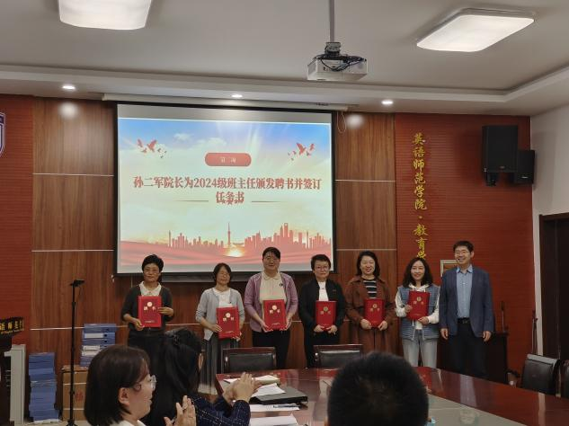 会议第二项,孙二军院长为2024级班主任颁发聘书,并一同签订《班主任年度工作任务书》。