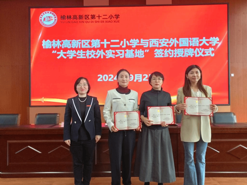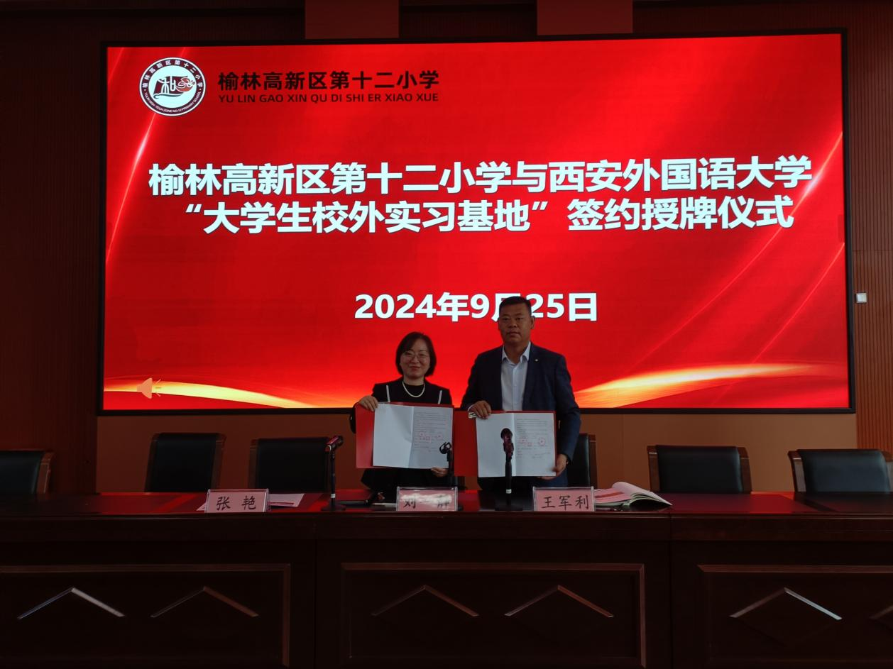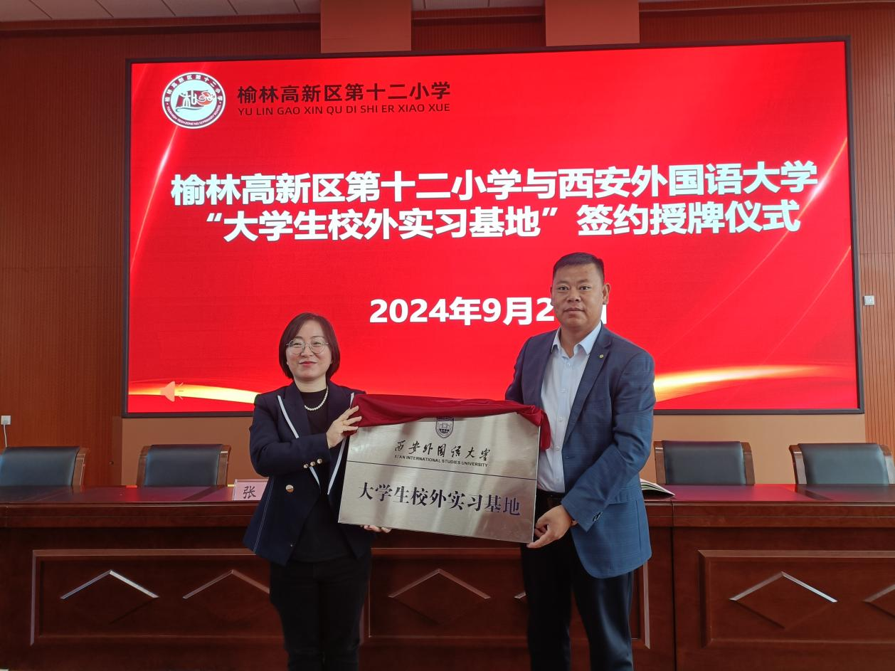 随后,刘一静一行前往榆林高新区第十二小学参加西安外国语大学“大学生校外实习基地”签约授牌仪式暨实习生见面会。榆林高新区第十二小学书记、校长王军利,特色创建中心主任张艳、教学管理中心副主任王晶、实习指导教师代表以及九州娱乐