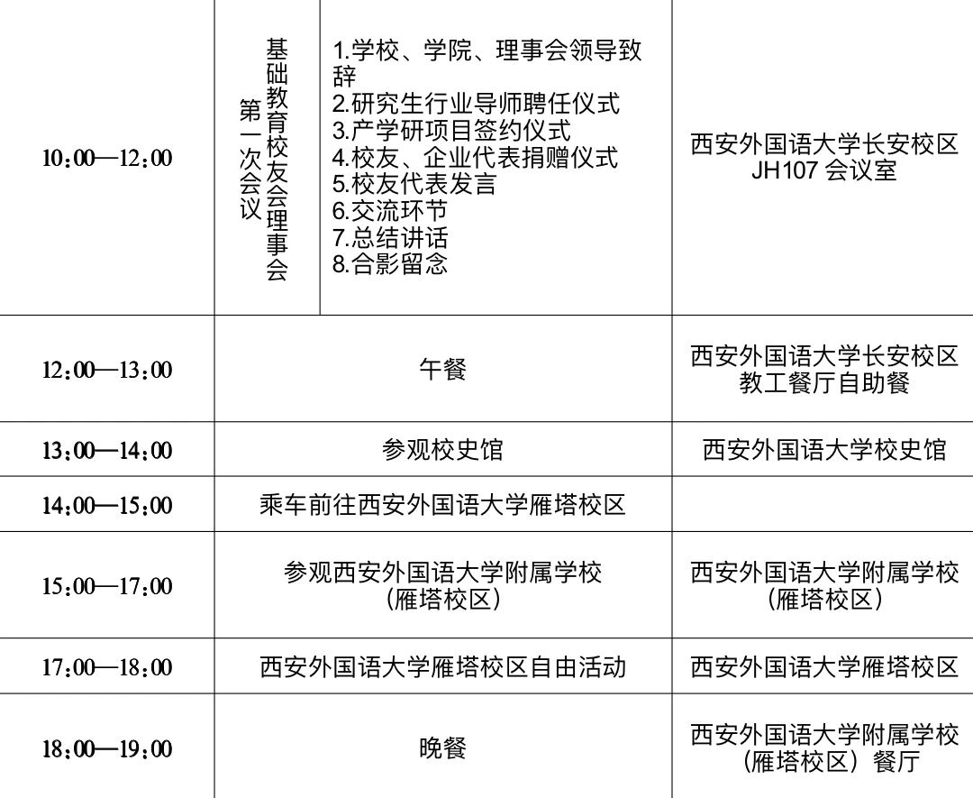与西安外国语大学基础教育校友会定于2025年4月2日在长安校区举办基础教育校友会理事会第一次会议。诚挚邀请基础教育校友会理事会成员及热心校友回校,共叙情谊,共谋发展。现将有关事宜通知如下。