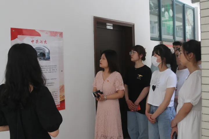 首先,陈嘉琪带领同学们参观了我们的主展区,主展区内的四个柱子上展示了习近平总书记在各项讲话中的金句;跟随她的脚步,同学进入长廊回顾我们党自中共一大以来的历史。讲解的过程中,她对一些具有特殊意义的会议如中共二大,中共十三大等进行了着重讲解;同时,也对一些词语如红船精神等给出了专业的翻译,使听者受益匪浅。