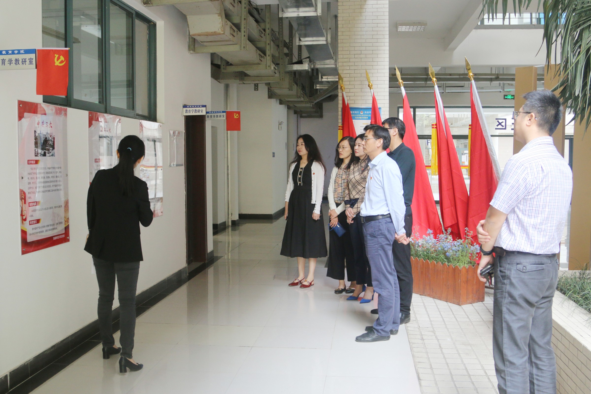 志愿者讲解队指导教师兼首席讲解员刘芳老师用熟练的中英文双语为来访者详细讲解了专区内的相关板块内容。在党建文化长廊,,全体党员面对党旗,在党支部书记郑锐华的领誓下,重温了入党誓词。