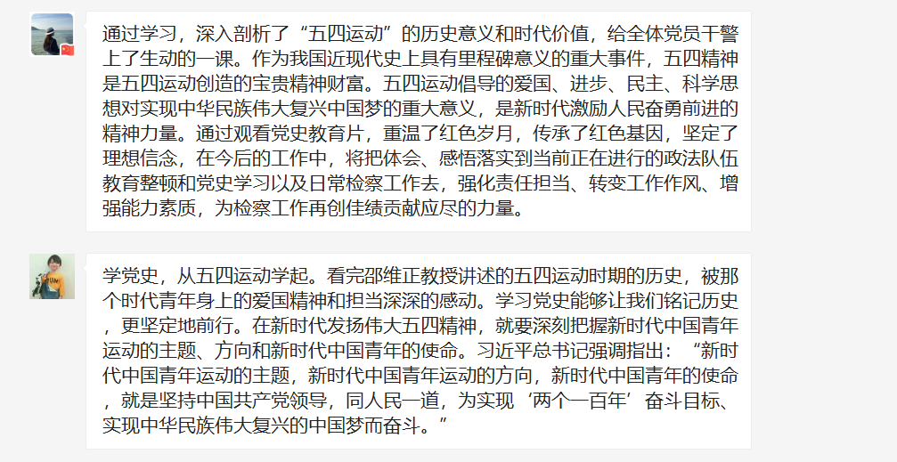 最后,全体党员进行党史学习并观看了党史教育视频《党史故事100讲之五四运动·唤醒民众》。视频结束后薛璐进行会议总结,全体党员撰写个人心得并进行交流分享。