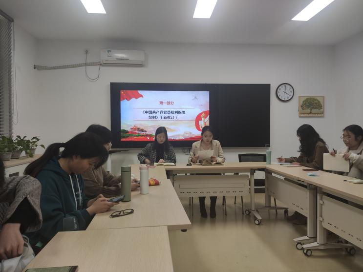 支部首先在薛璐的带领下集体学习了《中国共产党党员权利保障条例》(以下简称《条例》)。《条例》共分为总则、党员权利的行使、保障措施、职责任务和责任追究五个部分。接着,支部副书记钟玲玲通过七个问题对《条例》内容进行深层解读,进一步夯实了党员同志的学习成果。