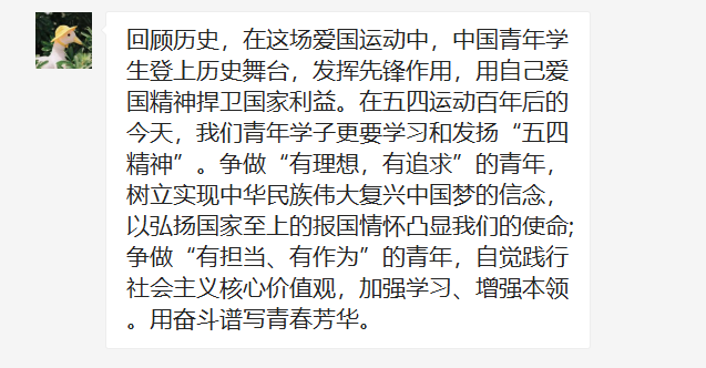 鲍文蓓:回顾百年党史,我们党在内忧外患中诞生、在愈挫愈勇中成长、在攻坚克难中壮大,伟大的中国共产党不忘初心、牢记使命,带领着全国人民走向着一个又一个胜利。今日的党史学习让我更深刻地懂得了五四运动是中国近代史上划时代的里程碑,它以辛亥革命所不曾有的姿态,展开了彻底地反对帝国主义和封建主义的斗争,标志着中国新民主主义革命的开端,也为中国共产党的建立作了思想上和干部上的准备。一个时代有一个时代的历史任务,一代青年有一代青年的使命担当。建成社会主义现代化强国,实现中华民族伟大复兴,是一场接力跑。我们作为祖国的当代青年,要不断激发奋斗精神、拼搏精神,充分展现自己青春心向党、建功新时代的奋进姿态,用“奋斗的青春最美丽”的实际行动为青春梦增光、为中国梦添彩,不断谱写无愧于前辈、无愧于时代、无愧于人民的壮丽篇章。