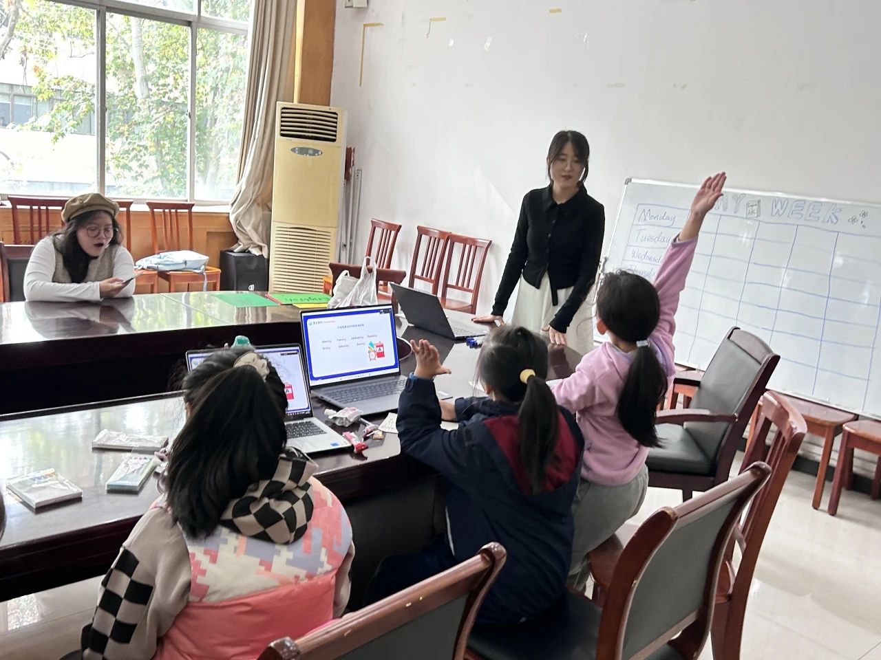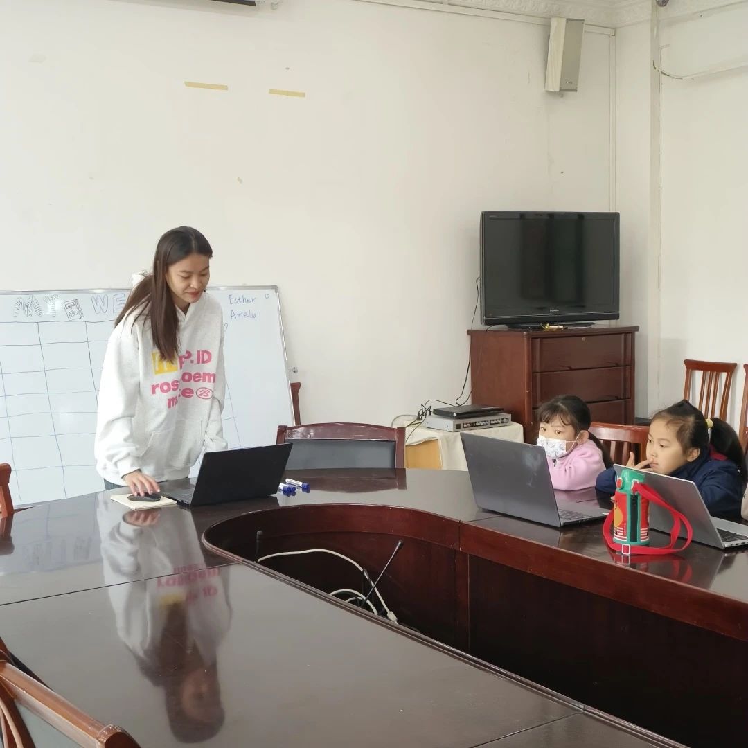 经过简单的自我介绍,本次课堂正式开始。老师们回顾复习了上节课所学的单词,让大家观察单词有什么共同点,开始今天的教学。