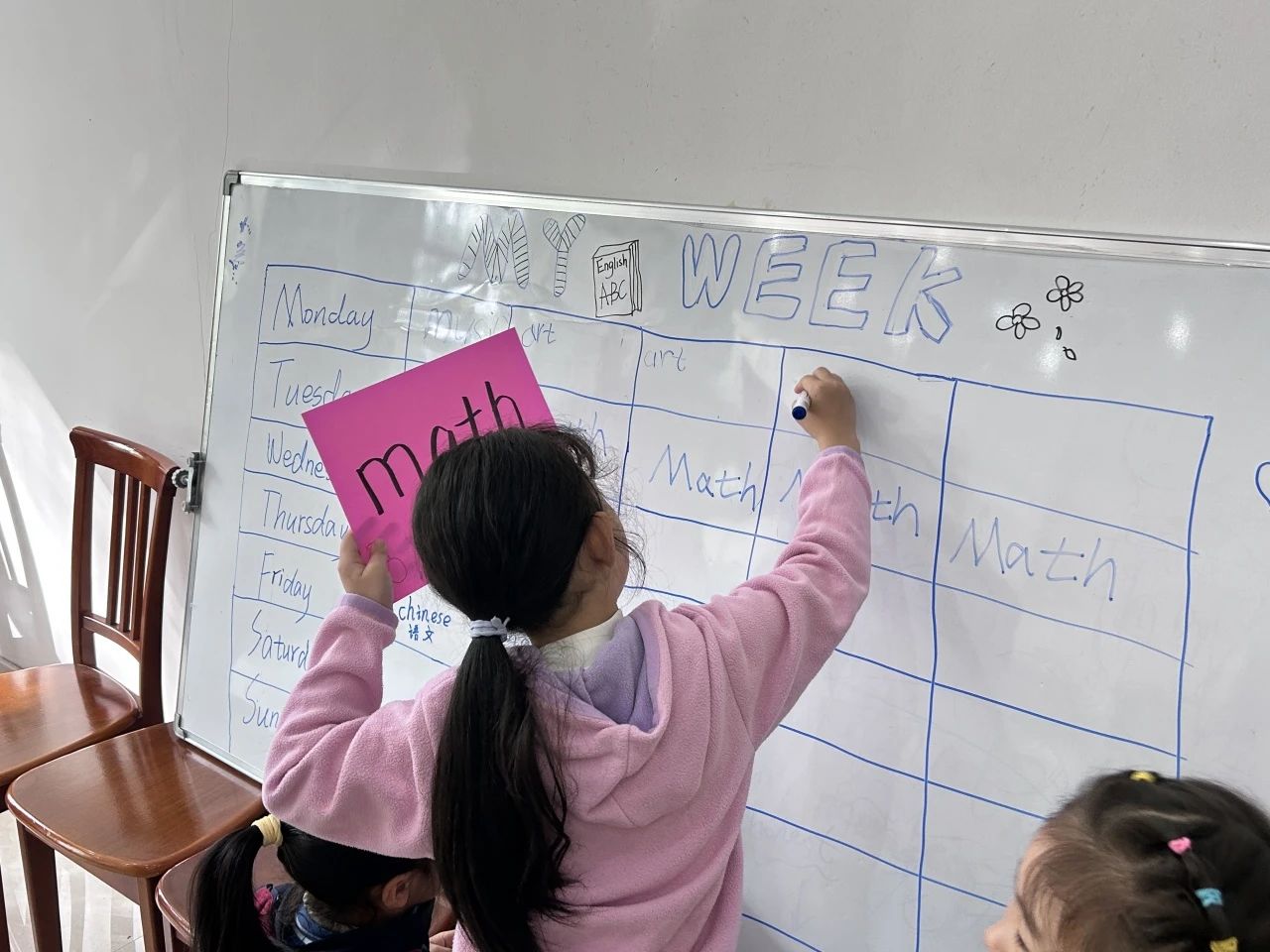 接着,两位老师采用制作创意课表的方式,让同学们一起制作一张属于自己的英语课表可以思维,有利于后面教学的开展。通过对课堂内容的讲解并带领学生们朗读单词及字幕,使同学们更好地掌握不同科目的读音表达,加强了大家对知识的记忆。
