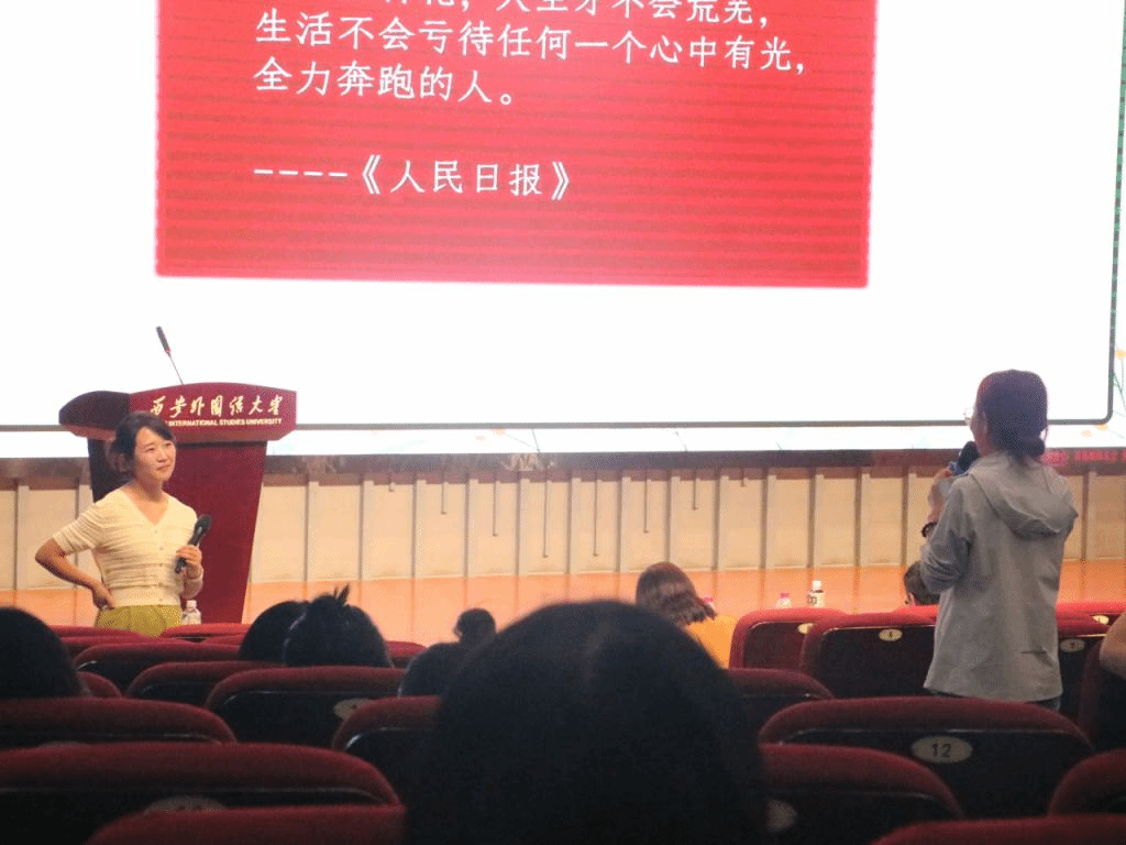 在分享会上,蔡薇老师分别从“个人成长经历”和“同学们关注的四个问题”两个方面展开分享。她提到,在母校求学的四年,她扎实学习提升专业素养、努力参赛提高竞技能力、积极实践拓展视野眼界,不断地突破自我、提升自我,年少的意气与热情在西外的校园里得到了充分的展示。凭借着大学四年的学习与锻炼,进入工作后的她,无论是在陕西师范大学兴新区小学还是在碑林区铁五小学,都能得心应手地应对自己的工作,并荣获西安市教学能手。师恩难忘,蔡老师在分享时提到,自己当年的进步和如今的成绩离不开大学四年老师们的帮助和支持,对曾经的任课教师和辅导员均表达了深深的感谢之情。