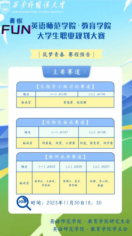 本次大赛的就业赛道分为材料筛选、主题陈述和模拟面试三个环节。模拟面试环节下设三个分赛道:无领导小组讨论、结构化面试赛道以及教师试讲,具体赛程预告如下: