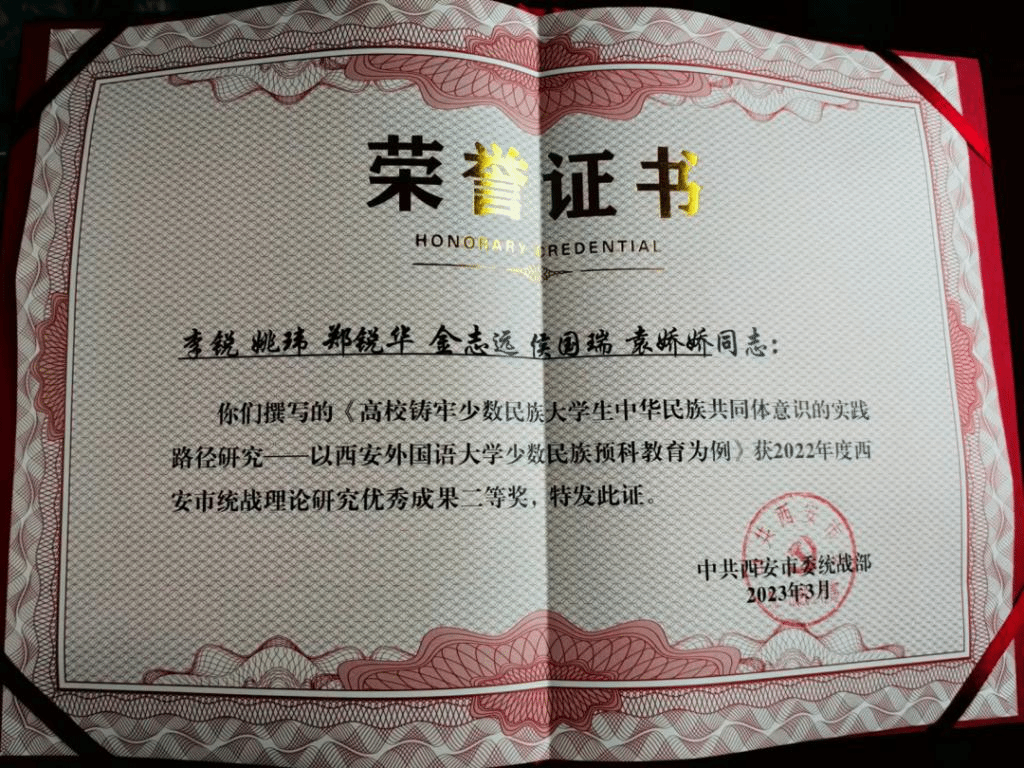 少数民族预科班撰写的《高校铸牢少数民族大学生中华民族共同体意识的实践路径研究——以西安外国语大学少数民族预科教育为例》获评二等奖;根据2023年全省统战部长会议精神和《中共陕西省委统战部关于表彰2022年度全省统战理论研究、实践创新、宣传和信息工作先进单位和先进个人的决定》文件,该论文获评“2022年度全省统战理论研究成果三等奖”,项目组成员:李锐、姚玮、郑锐华、金志远、侯国瑞、袁娇娇。