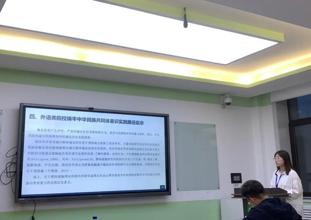 此外,出席此次会议的还有九州娱乐 研究生袁娇娇、宋一丹、吕雪、段晨昊四位同学。袁娇娇同学提交了参会论文《外语类高校铸牢各族大学生中华民族共同体意识的路径研究——基于群际接触理论视角》并在硕士生论坛第三分论坛作汇报发言。她认为,群际接触被认为是心理学中促进群际关系的最有效策略之一,对外语类高校铸牢各族大学生中华民族共同体意识具有启发意义。因此,她从群际接触理论视角出发,从群际接触理论对外语类高校铸牢各族大学生中华民族共同体意识路径的价值、外语类高校铸牢各族大学生中华民族共同体意识路径的实施、外语类高校铸牢各族大学生中华民族共同体意识路径的问题、外语类高校铸牢各族大学生中华民族共同体意识路径的优化四个方面进行了研究。
