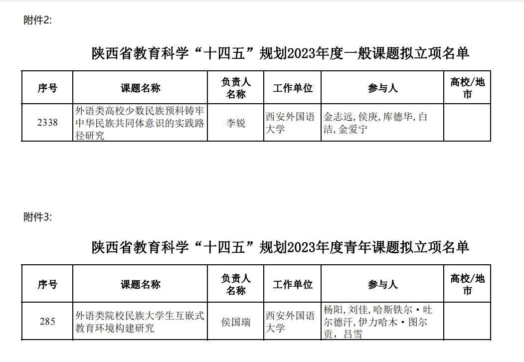 李锐副院长主持课题《外语类高校少数民族预科铸牢中华民族共同体意识的实践路径研究》成功获批一般课题立项;侯国瑞老师主持课题《外语类院校民族大学生互嵌式教育环境构建研究》获批青年课题立项。