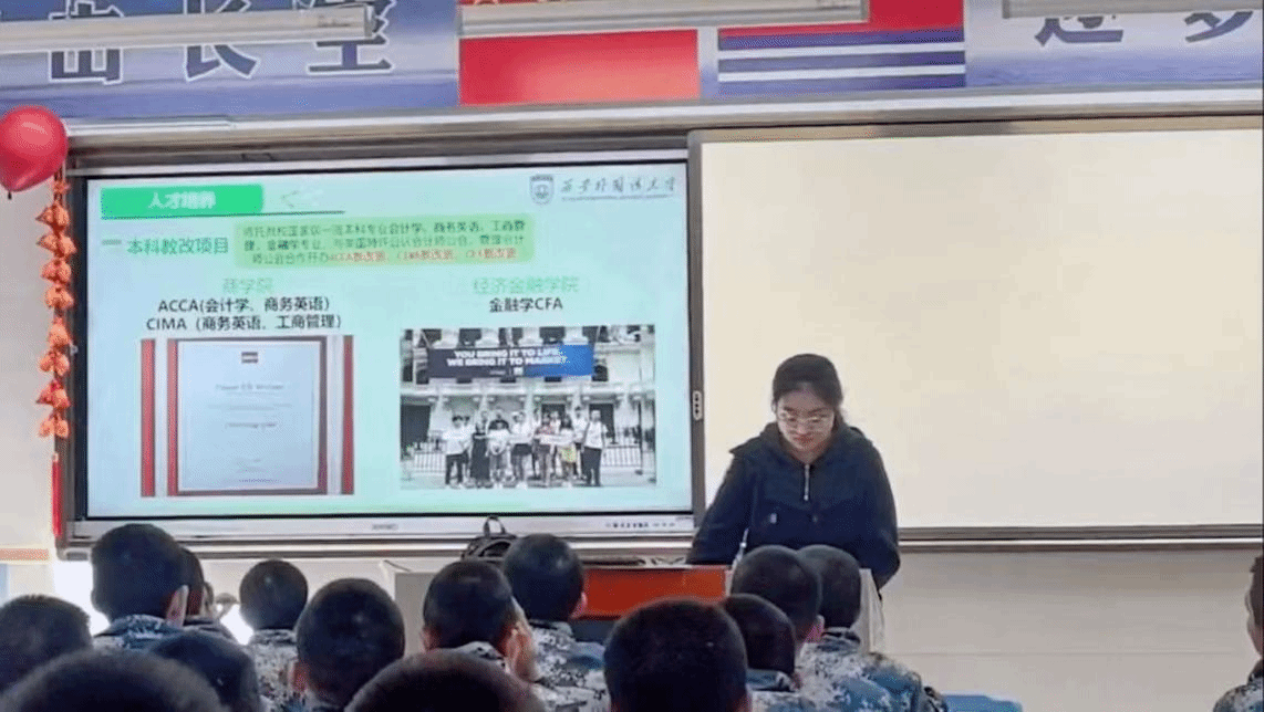 筹备回校宣讲西外时,我用心收集资料,精心打磨讲稿,一心想把西外的魅力精准呈现。宣讲那天,看着学弟学妹们满是好奇与期待的眼神,我既紧张又激动。我详细介绍西外丰富的课程、多彩的社团活动,展示校园美景,分享自己的成长点滴。互动时,大家踊跃提问,对大学生活的向往之情溢于言表,我耐心答疑,分享经验。