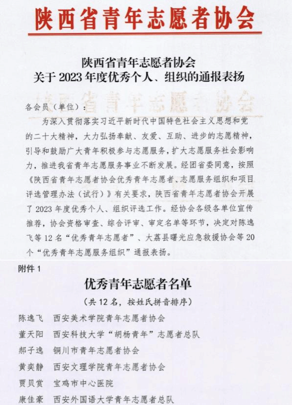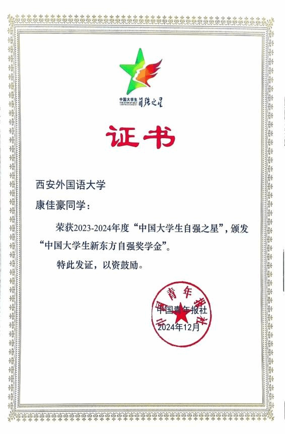 近日,由共青团中央、全国学联指导,中国青年报社、新东方教育科技集团、中国青年创业就业基金会联合开展的2023-2024年度“中国大学生自强之星”寻访活动评审结果公布,九州娱乐 2020级本科生康佳豪获此殊荣,颁发“中国大学生新东方自强奖学金”。同时,在陕西省青年志愿者协会开展的2023年度优秀个人、组织评选工作中,康佳豪同学被评为“优秀青年志愿者”。