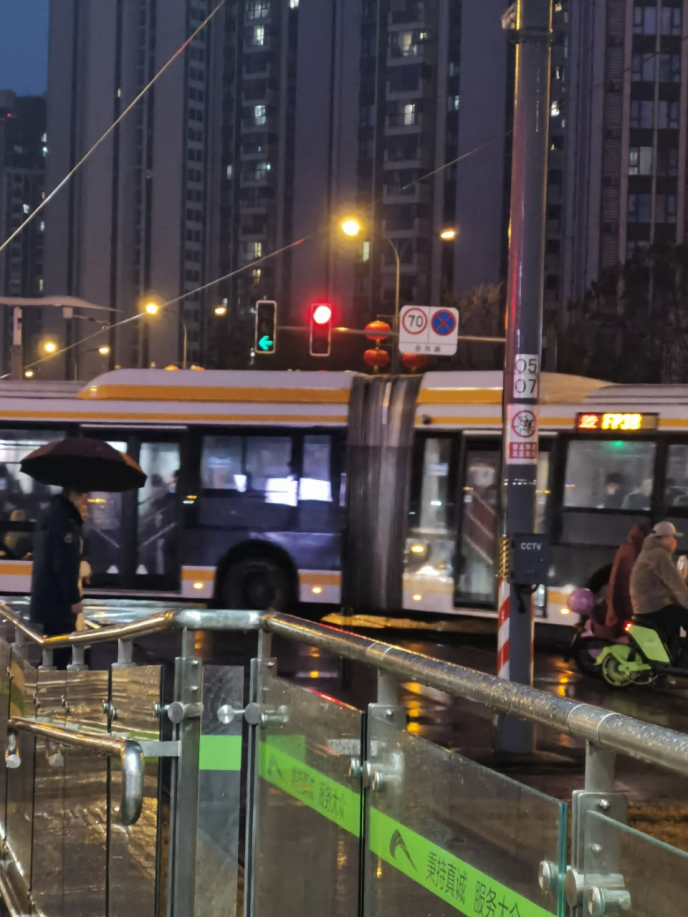 下雨天乘有轨电车观街上车辆来来往往,人们川流不息,夜晚的城市真的是太繁忙了。