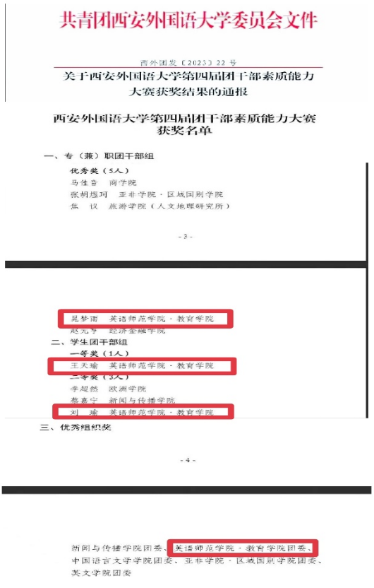 团委荣获优秀组织奖,分团委书记晁梦雨荣获专(兼)职团干部组优秀奖,21级学生王天瑜、刘瑜分别荣获学生团干部组一等奖和二等奖。