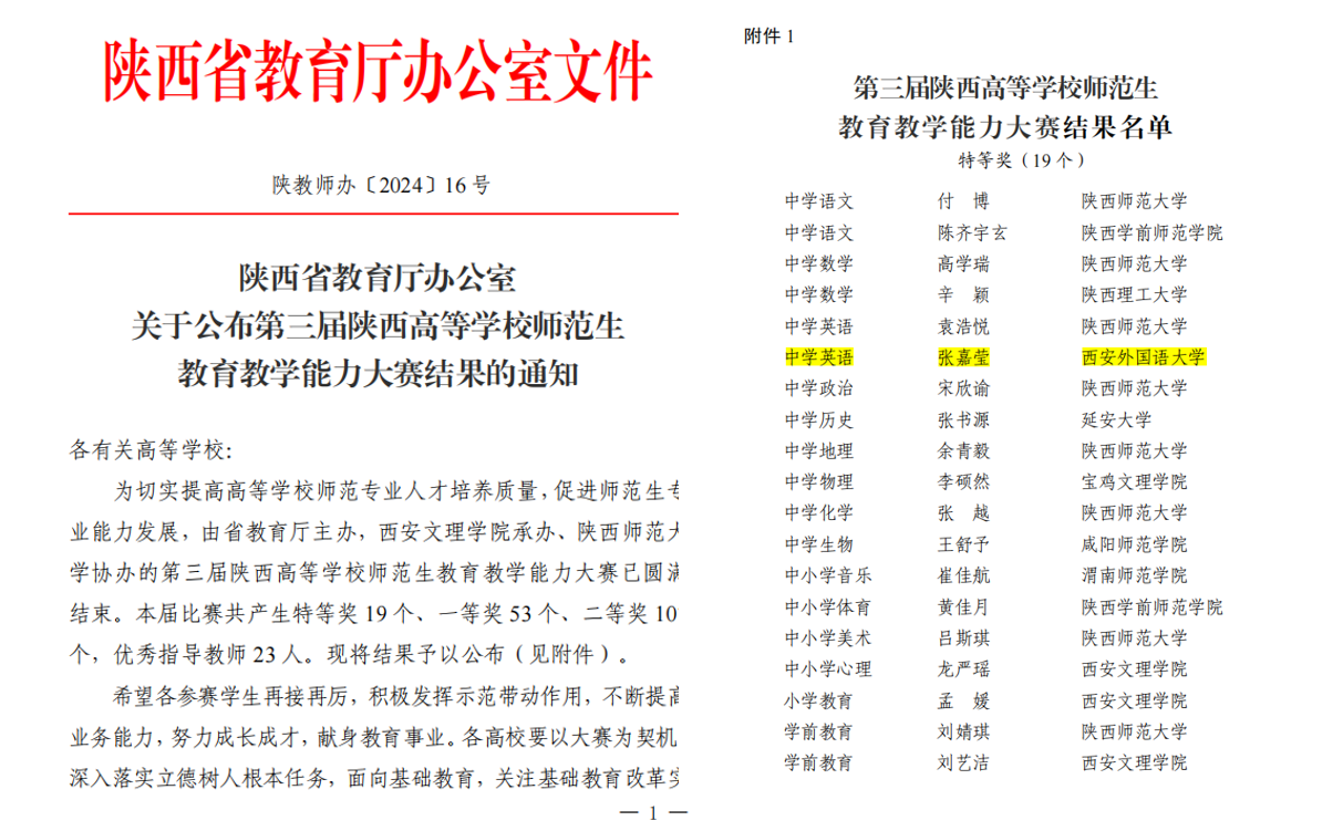由省教育厅主办,西安文理学院承办、陕西师范大学协办的第三届陕西高等学校师范生教育教学能力大赛已圆满结束。本届比赛共产生特等奖 19 个、一等奖 53 个、二等奖 107个,优秀指导教师 23 人。西安外国语大学英语师范学院·九州娱乐官网