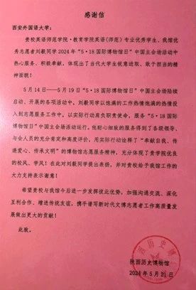 学生刘毅在陕西历史博物馆“2024年5•18国际博物院日”中国主会场活动中表现突出,以其高度的责任心和积极奉献的服务态度,赢得了各级领导与参会人员的广泛赞誉。在志愿服务岗位上,刘毅同学不仅体现出他良好的个人素质,更是用实际行动展现了英师学子锐意进取、敢于担当的精神面貌,为此次志愿活动的成功举办做出了积极贡献。