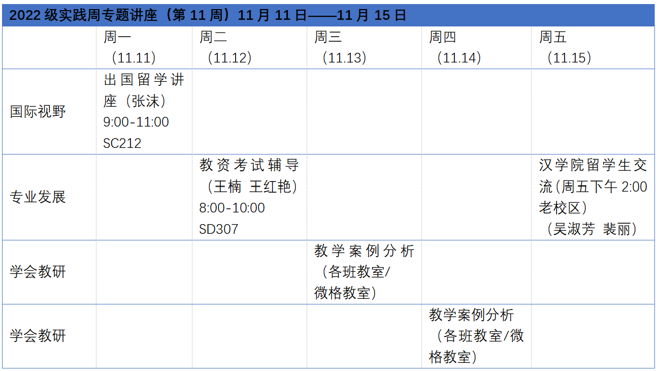 学生专业发展,强化其师范生专业素养,拓展国际视野,2022级英语师范1-8班在实践周以讲座和专题辅导的形式开展与教资考试专题辅导、出国留学指导、汉学院留学生交流、教学案例分析等相关主题指导与实训。