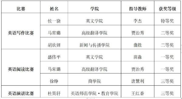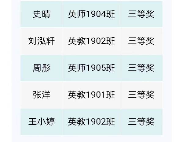 经过激烈角逐,2018级英语师范专业王大卫同学获得中学英语组唯一特等奖,2018级英语师范专业张雁同学和2019级英语师范专业何佳妮同学分别获得比赛一等奖。