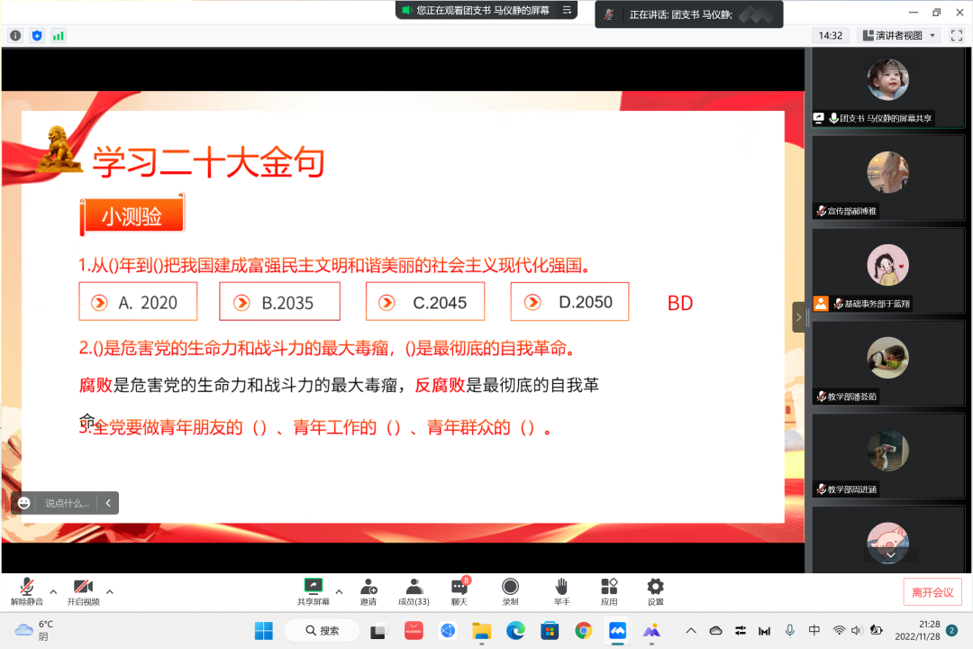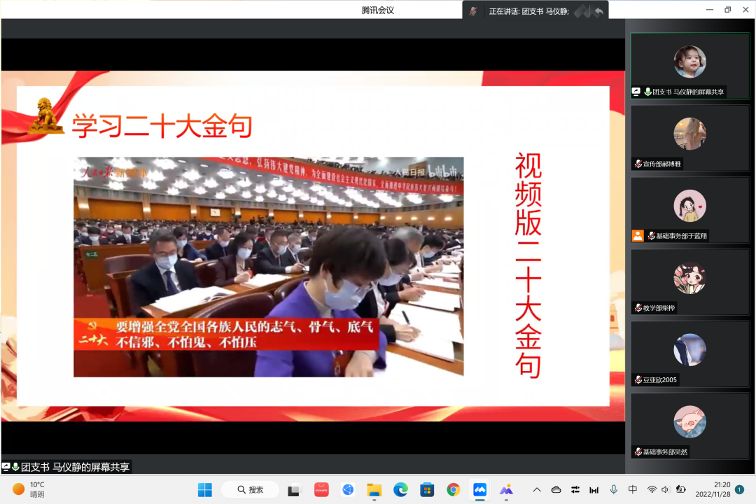 接下来,团支书通过视频学习的方式,向我们展示了二十大的金句。在观看完视频之后,又对二十大金句进行了一个整理,随后,又来到了紧张的小测试环节,通过对一些问题的展示和再现,既加深了同学们的理解、感悟以及思考,同时又检测了我们的学习成果。同学们奋勇争先,积极回答问题,充分展示了对二十大报告的熟悉和了解。