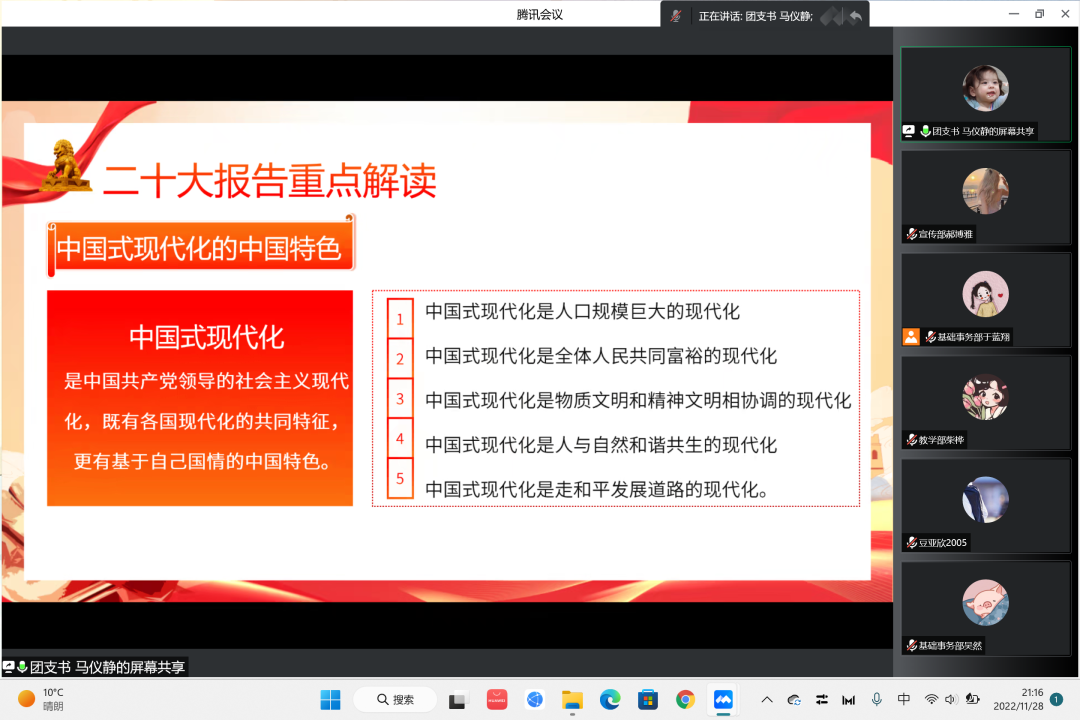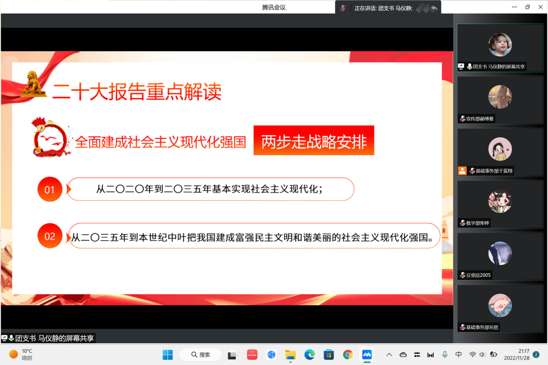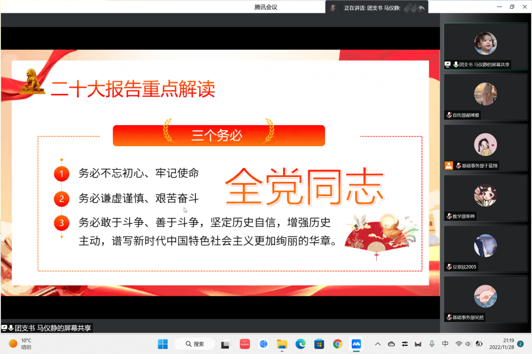 解读活动主要围绕以下几个方面展开,第一,以党的三件大事为主要展开点进行解读;第二,以两步走战略安排为切入点进行学习;第三,以全面从严治党、深入推进新时代党的建设新的伟大工程为着力点。团支书马仪静同学集中介绍了三个务必,以及全党同志应必须掌握的一些原则。通过对三件大事的阐述,让我们了解到了开辟马克思主义中国化时代化的重要性。通过对“六个必须坚持”的学习,我们明白了新时代新征程下,中国共产党的使命和任务。通过学习两步走战略安排,我们明白了全面建成社会主义现代化强国,实现中国式的现代化的意义所在。我们对坚定推动全面从严治党,深入推进新时代党的建设新的伟大工程更加充满信心。