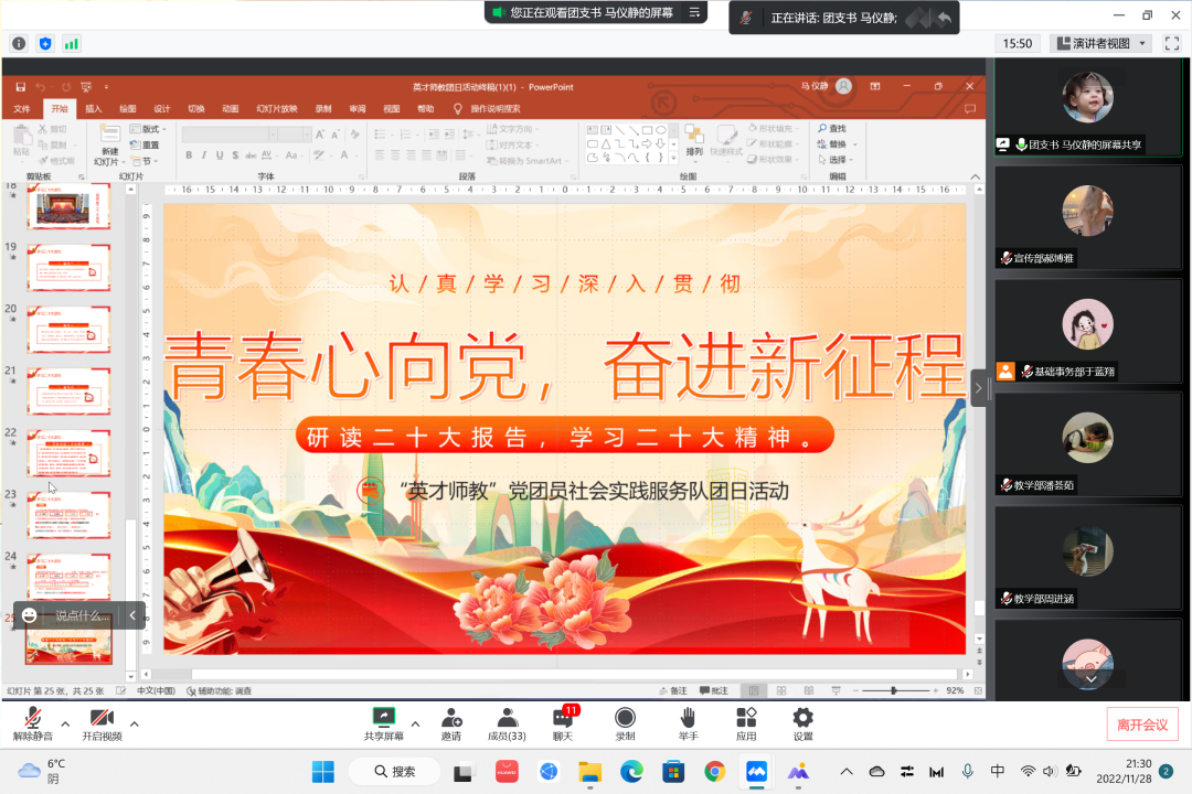 2022年11月28日晚上21时,“英才师教”党团员社会实践服务队在线上顺利进行了主题为“青春心向党,奋进新征程”的团日活动。