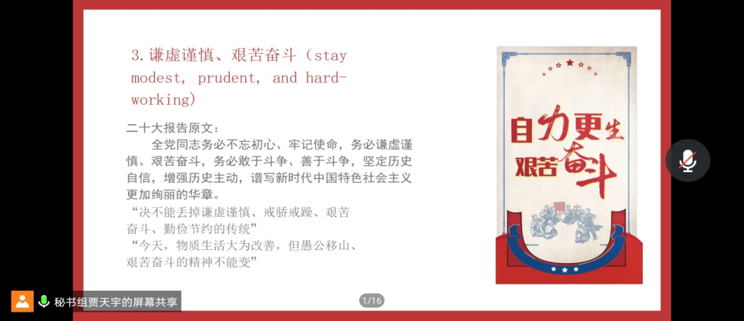 奋进新征程、建功新时代,必须大力弘扬伟大建党精神。党的二十大报告全文贯穿着伟大建党精神的深刻意蕴,大会主题就包括“弘扬伟大建党精神”。贾天宇同学从伟大建党精神的发源、三十二字内涵及现实意义出发,引导同学们弘扬伟大建党精神、凝聚强大奋进力量。