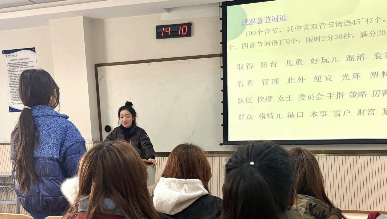 在培训中,侯国瑞老师首先详细讲解了普通话水平测试的试卷构成,让同学们对考试的构成有了细致的了解,并让同学们现场试读,通过实践及时发现学生存在的语速过快、声音偏小及声调不准确等问题,并一一进行了纠正。侯老师系统阐述了考试的评分标准与细则,使同学们对测评要求有了清晰的认识,并重点讲解了考前应如何有效准备,以及考试中的实用应试技巧,帮助同学们提升备考效率与临场发挥能力,让同学们对于如何备考有了清晰的方向,面对考试也更具信心。