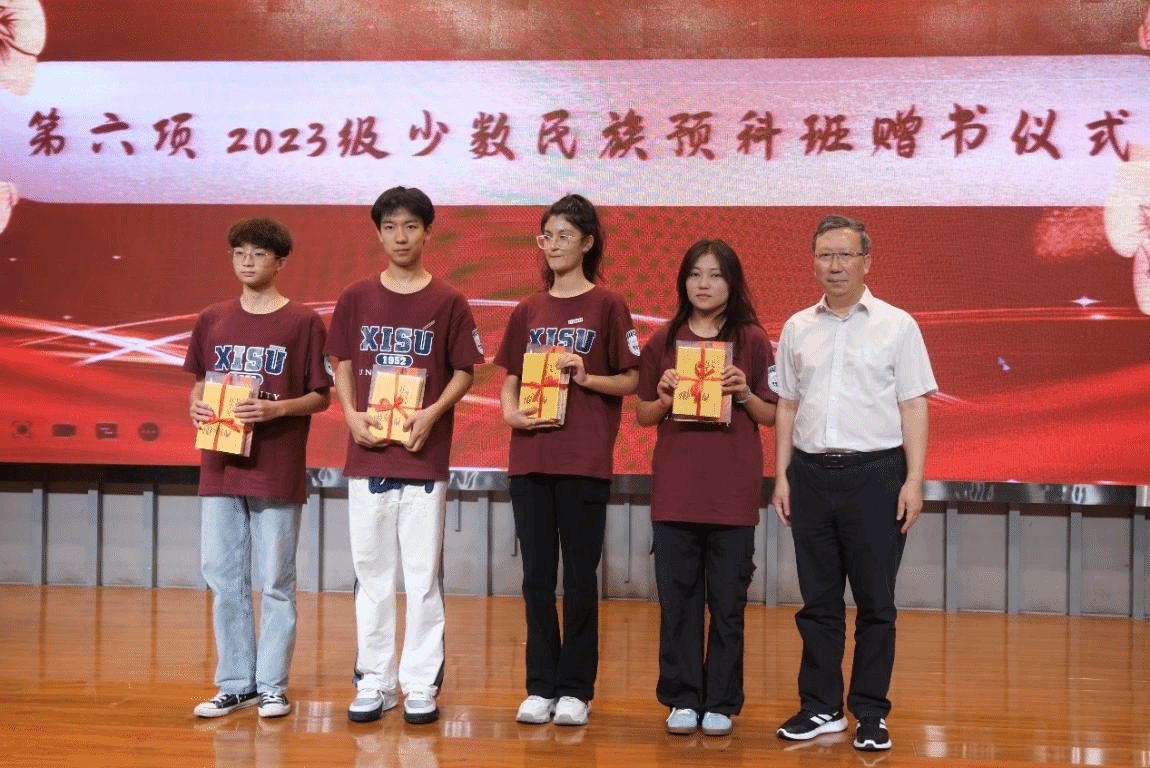 随后,典礼进入2023级少数民族预科班赠书环节,现场播放了预科班新生与家长共同诵读经典的视频,书声琅琅,家风传承,书同文、语同音,方能心相通、情相融。王启龙校长上台为预科班新生代表赠书《学庸论语》和《上下五千年》,鼓励同学们诵经典、学历史、悟人生。