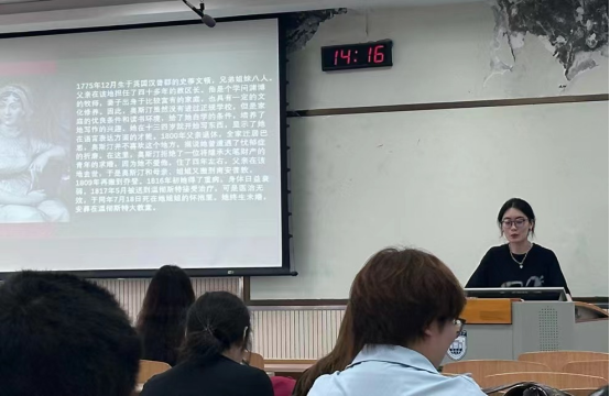 文学,作为人类情感与思想的精致表达,是语言艺术的巅峰之作,承载着深厚的审美意识和文化内涵。讲座中,王怡涵老师带领同学们穿越时空,概览了18世纪末至19世纪初英国文学的辉煌历程,聚焦了当时社会背景对文学创作的影响,以《傲慢与偏见》为例,深入介绍了作者简·奥斯汀的生平轶事、独特的写作风格以及它在文学史上的地位。通过对小说中经典台词的分享和角色对话的朗读,学生仿佛置身于那个充满阶级与婚姻纠葛的时代,感受着伊丽莎白·班纳特与达西先生之间微妙的情感变化。最后,王老师与同学们进行现场互动,并一一解答相关提问。大家纷纷表示,通过此次沙龙活动,进一步深化了自身对英语文学创作的理解,并会在之后积极尝试英语文学创作。
