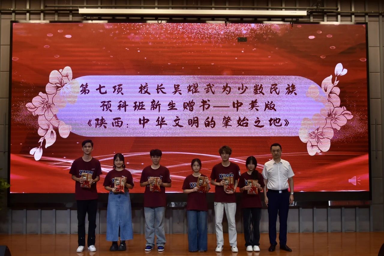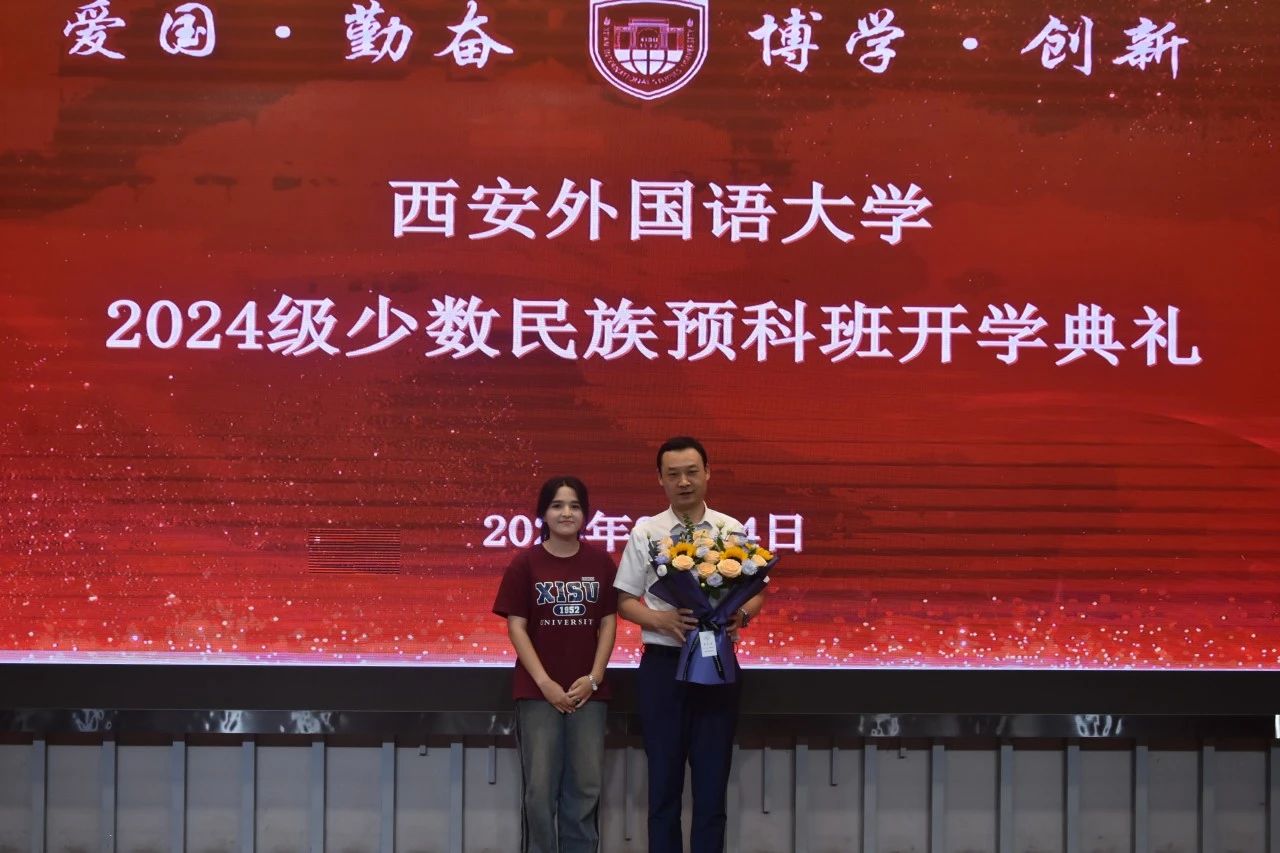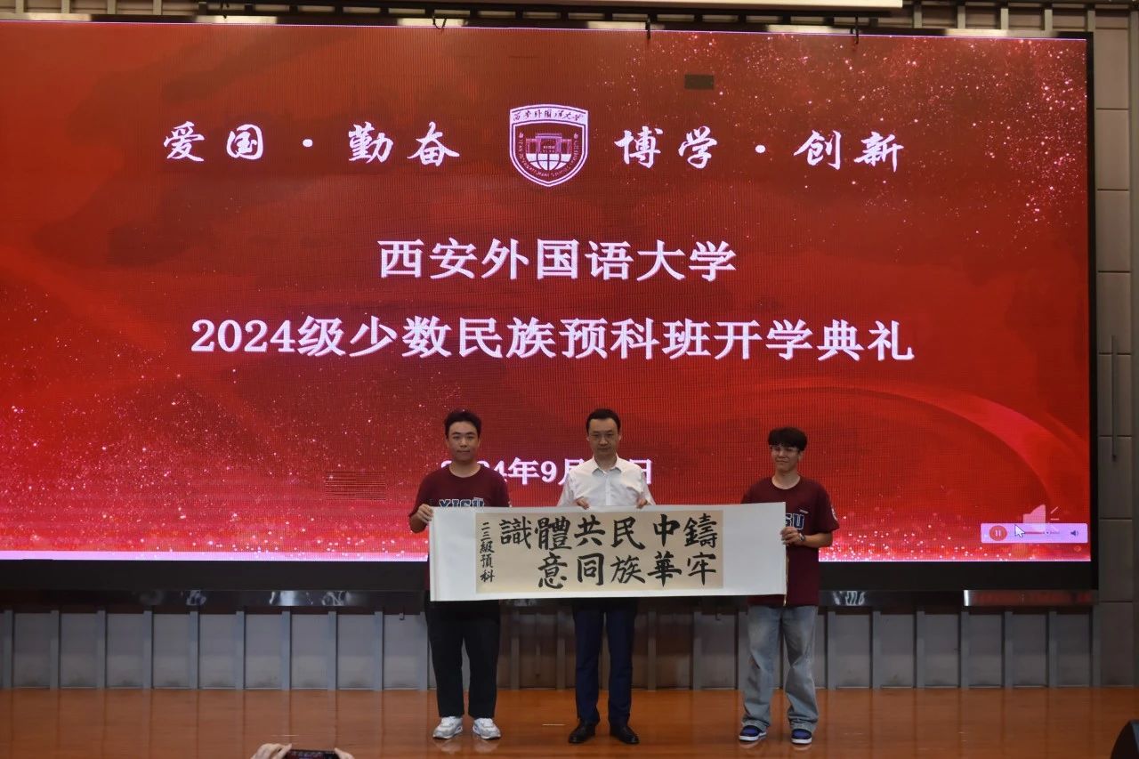 典礼上,校长吴耀武亲自为全体预科生送上特别礼物——亲笔签名的《陕西:中华文明的肇始之地》,以此独特的方式,寄予他对学子们的殷切期望与深情祝福。同时,吴校长深情回顾了首届少数民族预科班的美好回忆,强调质朴品质对于青年成长的重要性,鼓励学生们保持初心,在任何环境中都保持坚韧不拔的精神面貌。他进一步强调,学习不仅是获取知识的过程,更是塑造人格的关键阶段。他鼓励每位学子树立远大目标,全力以赴,追求卓越,为将来选择心仪的专业奠定坚实基础。同时,鉴于预科生多元化的文化背景,他特别提及了团结与包容的价值,希望同学们能够在相互尊重与理解中共同进步,构建一个和谐融洽的学习环境。在场的每一位预科生深受鼓舞,他们向吴校长回赠了两份极富象征意义的礼物。一份是23级预科生的书法作品——“铸牢中华民族共同体意识”,每一笔都流淌着对中华民族伟大复兴的向往与贡献的决心。另一份则是一束散发自然香气的鲜花,它们如同同学们纯洁的心灵,寄托着对吴校长的深切敬意和对西外的美好憧憬。
