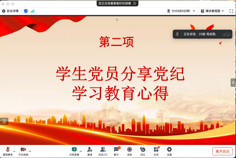 会议第二项,学生党员代表进行学习分享。两位学生党员分享了她们将党纪学习教育与专业结合的心得体会,探讨了作为研究生如何将党的纪律要求融入到日常工作、研究和实践中。学生党员的分享不仅展现了他们对党纪党规的深刻理解,也体现了新时代学生党员积极向上、勇于实践的精神风貌。