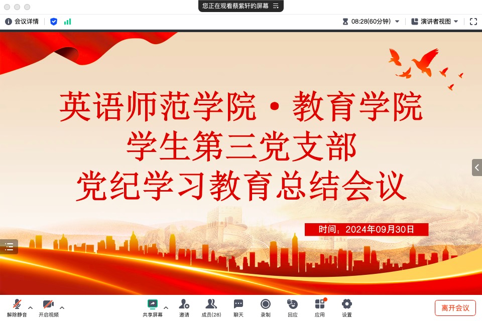 为进一步强化学生党员的纪律意识和规矩意识,学生第三党支部于2024年9月30日召开了党纪学习教育总结会议。支部全体党员参加会议,会议由支部副书记蔡紫轩主持。